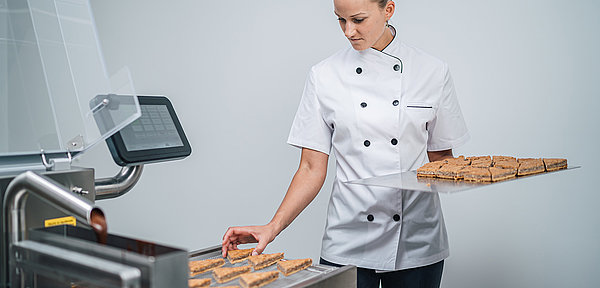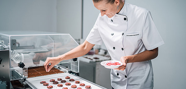 Our range of machines includes chocolate coating machines with coating widths from 18 cm to 60 cm, tempering machines with processing capacities from 25 to 400 kg per hour, matching chocolate dissolvers and cooling tunnels, and a wide variety of accessories.