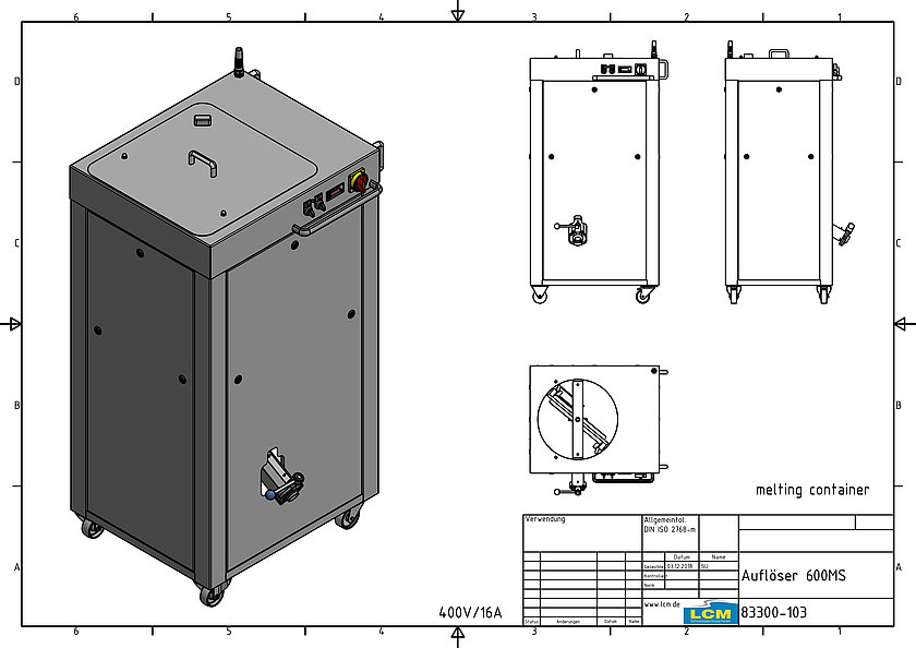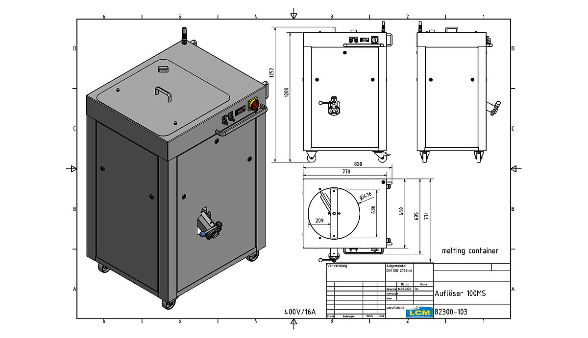 - Machine housing made of stainless steel, mobile on stable swivel castor